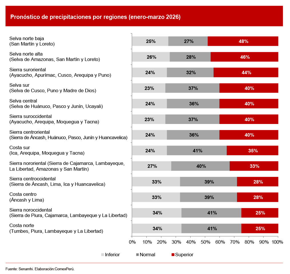 Cabe resaltar que no existe certeza sobre la ocurrencia de precipitaciones superiores a lo habitual, dado que, como máximo, existe una probabilidad cercana al 50% de ocurrencia en la selva norte (Amazonas, San Martín y Loreto) y la sierra suroriental (Ayacucho, Apurímac, Cusco, Arequipa y Puno), de acuerdo con el Servicio Nacional de Meteorología e Hidrología del Perú (Senamhi). En la mayoría de las regiones es igual o más probable que ocurran precipitaciones normales. Por esto, el riesgo de afectaciones que generarían las lluvias se explicaría por deficiencias en la inversión pública.