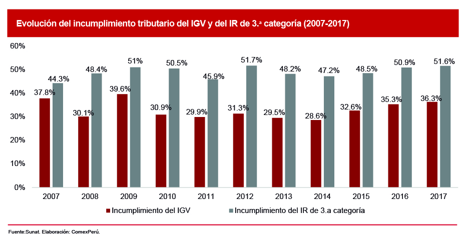 Actualmente, nuestro régimen mantiene la predominancia del IGV como principal fuente de recaudación, seguido del IR en todas sus categorías, pues ambos representaron el 80% de los ingresos tributarios del Gobierno central descontando devoluciones en el periodo 2015-2019. Sin embargo, los problemas de evasión y elusión persisten en altos niveles. Según datos de la Sunat, en 2017 se alcanzó un incumplimiento del IGV de un 36.3% y un incumplimiento al IR de 3.a categoría del 51.6%, ambos porcentajes inferiores al porcentaje chileno del 19.9% y el 39.2%, respectivamente.