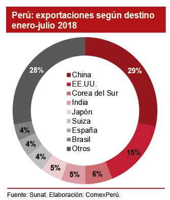 Entre enero y julio de este año, las exportaciones peruanas alcanzaron un valor de US$ 27,994 millones, lo que representó un incremento del 18.1% con respecto al mismo periodo del año anterior, impulsado principalmente por los mayores envíos de productos mineros (+20%), de petróleo y derivados (+32.9%) y agropecuarios (+16.8%). Nuestros destinos más importantes en estos primeros siete meses del año fueron China, EE.UU., Corea del Sur, India y Japón.