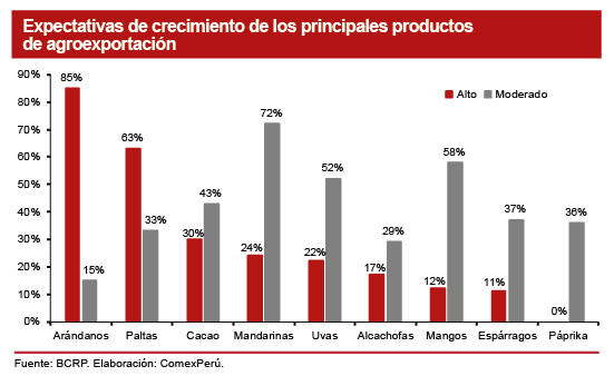 En cuanto a expectativas de crecimiento, el sector agroexportador en promedio se mostró optimista con respecto al crecimiento del sector no tradicional. El 85% espera un crecimiento alto de la exportación de arándanos (US$ 85 millones; +69.7%)[1] y el 63% prevé una aceleración de las exportaciones de paltas (US$ 455 millones; +14.8%). En cuanto a las diferencias en el desempeño agroexportador por regiones, Arequipa lideró el ranking de regiones donde los exportadores considerarían expandirse (19% de las respuestas), seguida por La Libertad (13%) y Piura (10%). Sin embargo, la insuficiencia de infraestructura, la falta de seguridad y la alta tasa de informalidad fueron algunas de las limitaciones asociadas a estas regiones.