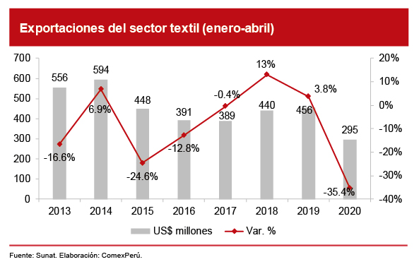 Como muchos otros sectores, el sector textil ha experimentado una caída en sus exportaciones durante el estado de emergencia. Según cifras de la Sunat, en el periodo de enero-abril, estas ascendieron a US$ 295 millones, un 35.4% menos respecto al mismo periodo en 2019. Particularmente en marzo y abril, las exportaciones del sector se redujeron un 38.1% y un 88.4%, respectivamente, si se comparan con los mismos meses del año anterior.