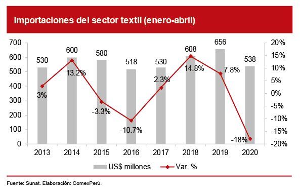 La paralización de la producción, la cancelación de órdenes del exterior y la reducción del consumo son los factores detrás del menor desempeño de nuestros envíos. Por supuesto, estos mismos factores han afectado las importaciones de textiles, las cuales cayeron un 18% en los primeros cuatro meses del año, al sumar US$ 538 millones, mientras que en los meses de marzo y abril retrocedieron un 42.7% y un 18.8%, respectivamente.