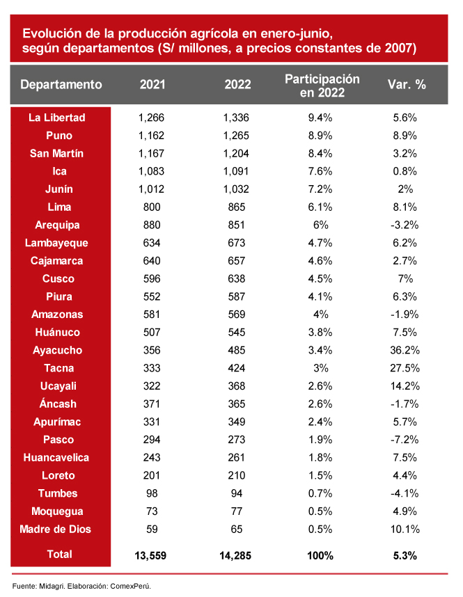 De acuerdo con el Ministerio de Desarrollo Agrario y Riego (Midagri), el valor de la producción agropecuaria ascendió a S/ 14,285 millones, a precios constantes de 2007, durante el primer semestre de 2022, lo que significó un incremento del 5.3% con respecto al mismo periodo de 2021. Es importante enfatizar que La Libertad concentró la mayor producción agrícola, con S/ 1,336 millones (9.4% del total; +5.6% respecto a 2021), seguido por Puno, con S/ 1,265 millones (8.9%; +8.9%), y San Martín, con S/ 1,204 millones (8.4%; +3.2%). Asimismo, Ayacucho explicó la mayoría del crecimiento, pues en este departamento la producción ascendió a S/ 485 millones a precios constantes de 2007, lo que significó un incremento de S/ 129 millones con relación a 2021 (+36.2%). En contraste, Arequipa tuvo el peor resultado en términos absolutos al reducir su producción a S/ 851 millones (-S/ 28 millones).