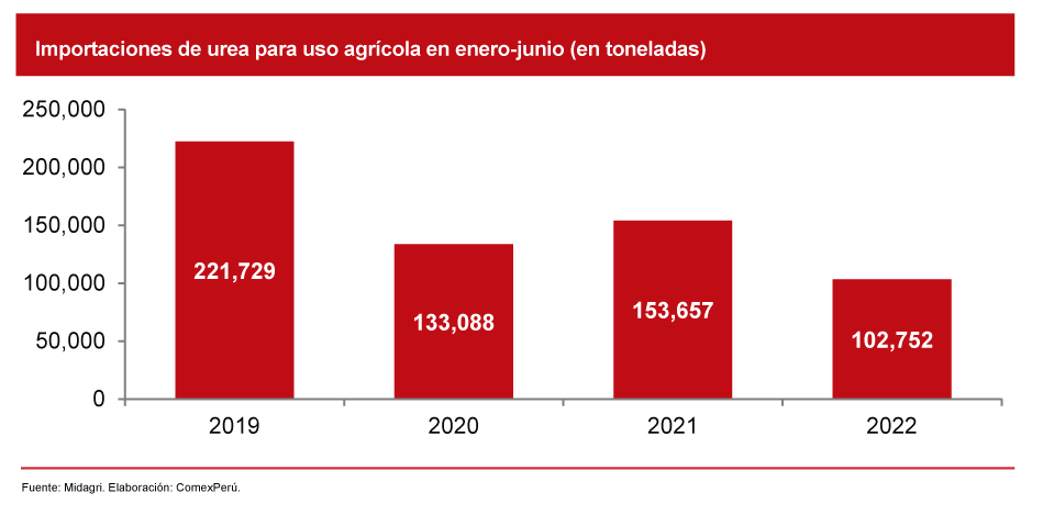 La situación es crítica debido a que la cantidad importada de urea para uso agrícola solo fue de 102,752 toneladas durante la primera mitad del año, según el Midagri. Es decir, con respecto al año pasado, se han dejado de importar cerca de 50,000 toneladas, y el monto actual representa menos de la mitad de lo importado en 2019. Además, los precios en junio de la urea se han, por lo menos, duplicado en todos los departamentos en comparación con el mismo mes de 2021 e, inclusive, en Amazonas el monto es más del triple, al aumentar de S/ 1,700 a S/ 5,886 por tonelada.
