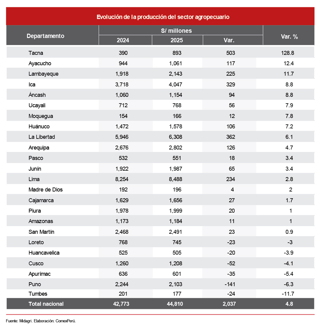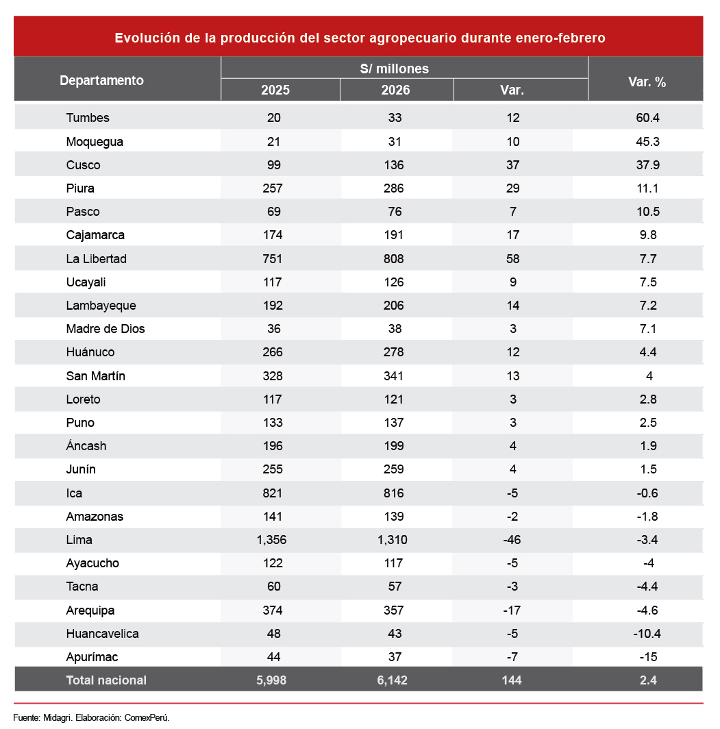 De acuerdo con el Midagri, a febrero del presente año, la producción nacional agropecuaria sumó S/ 6,141 millones (+2.4% respecto del mismo periodo de 2025). En total, 16 de 24 departamentos reportan un desempeño positivo. Tumbes aumentó su producción en un 60.4%, lo que supera ampliamente el resultado que reportó durante el primer bimestre de 2025.