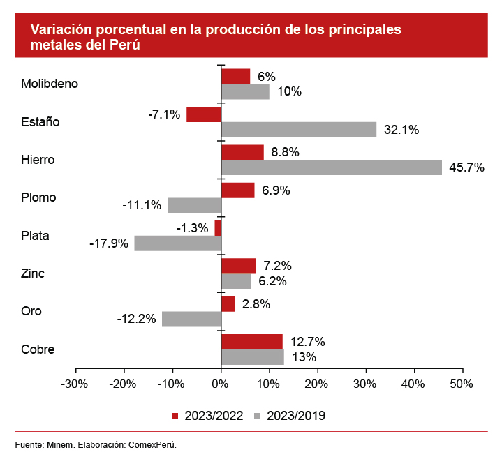 Con relación al comercio exterior, las exportaciones minero-metálicas ascendieron a US$ 39,639 millones en 2023, lo que representa un aumento del 11.3% con relación al año previo. Por su parte, las exportaciones de cobre en sus distintas presentaciones (concentrado, mineral, refinado y blíster) ascendieron a US$ 23,005 millones, lo que representa un incremento del 16.8% con respecto a 2022. A este metal le siguieron el oro, con US$ 8,553 millones (+12.3%), y el zinc, con US$ 2,223 millones (-17.3%), según datos de la Sunat.