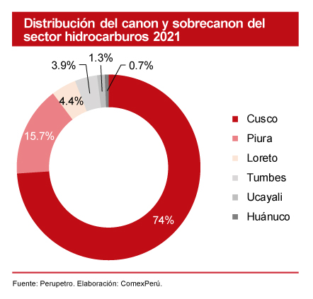 Respecto del canon y sobrecanon, esta actividad generó un total de US$ 2,808 millones en 2021[3], los cuales se distribuyeron de la siguiente manera: Cusco, US$ 2,077 millones (74%); Piura, US$ 441 millones (15.7%); Loreto, US$ 124 millones (4.4%); Tumbes, US$ 110 millones (3.9%); Ucayali, US$ 38 millones (1.3%); y Huánuco, US$ 19 millones (0.7%).
