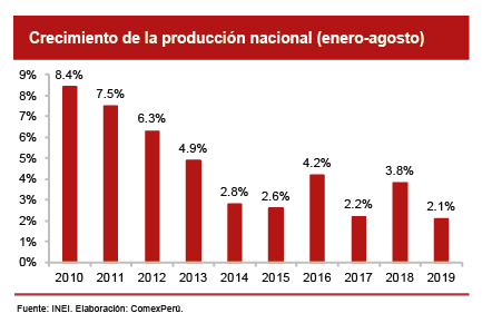 Según cifras del Instituto Nacional de Estadística e Informática (INEI), entre enero y agosto de 2019, la producción nacional registró un crecimiento de un 2.1% con respecto al mismo periodo de 2018. Si bien es un resultado positivo, no deja de llamar la atención que significa un crecimiento de 1.7 puntos porcentuales (pp) por debajo del alcanzado en 2018. A pesar de esto, la economía recuperaría parte del dinamismo visto en años anteriores si en los próximos meses se mantienen los resultados de julio y agosto, cuando se alcanzaron tasas de crecimiento de 3.3% y 3.4%, respectivamente, las mayores en lo que va del año. Cabe mencionar que los mayores aportantes al dinamismo en el mes de agosto fueron los sectores Minería e hidrocarburos (+0.54 pp), Comercio (+0.37 pp) y Otros servicios (+0.56 pp).