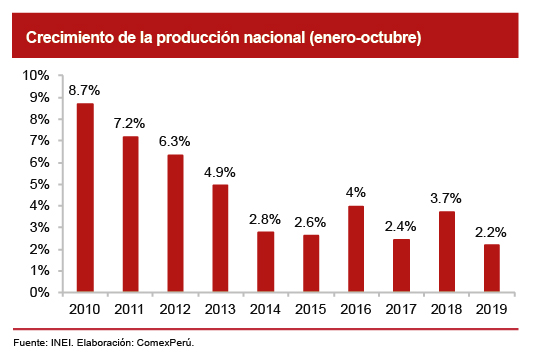 Según cifras del Instituto Nacional de Estadística e Informática (INEI), en octubre del año pasado, la producción en el Perú creció un 2.09% con respecto al mismo periodo de 2018. Incorporando este resultado al del resto del año, encontramos que el crecimiento para el periodo enero-octubre fue del 2.16%, alejándose del estimado anual del Banco Central de Reserva del Perú (BCRP), que en diciembre predijo una tasa de crecimiento económico del 2.3%. Cabe mencionar que, a pesar de una inminente desaceleración económica en 2019, la estimación de crecimiento para el Perú es la tercera más alta de la región, solo detrás de Colombia y Bolivia, cuyas economías se espera que crezcan un 3.2%, según el último reporte de inflación del BCRP.