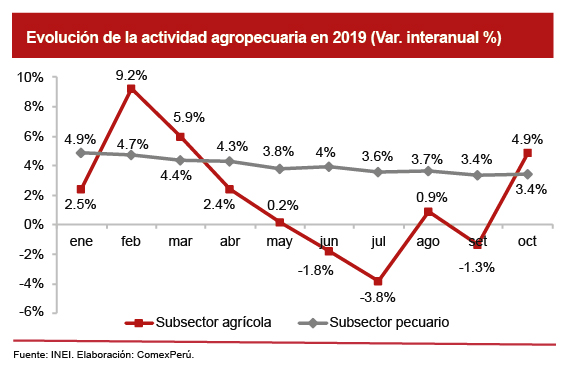 En cuanto al sector Agropecuario, es importante destacar que en octubre ha registrado su tercera tasa de crecimiento más alta del año (+4.3%) después de febrero y marzo, cuando creció un 7.2% y un 5.3%, respectivamente. Específicamente, el subsector agrícola experimentó un crecimiento de un 4.9% con respecto a octubre de 2018, recuperando dinamismo luego de cinco meses continuos de desempeño negativo o casi nulo. Por otro lado, el subsector pecuario, el cual representa un 36.6% del sector, continúa desacelerándose. En octubre, su crecimiento fue del 3.4%, el segundo más bajo del año.