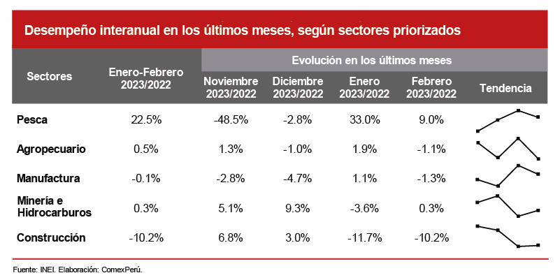 Durante el primer bimestre, el sector pesquero experimentó el mayor crecimiento entre todos los sectores (+22.5%), en comparación con el mismo mes del año anterior. Este aumento se debió principalmente a la pesca marítima (+26.3%), en particular por la extracción de anchoveta (590,695 toneladas, +287%), gracias a la vigencia de la Segunda Temporada de Pesca del recurso anchoveta del año 2022 en la zona Centro-Norte del litoral peruano, que concluyó la primera semana de febrero de 2023.