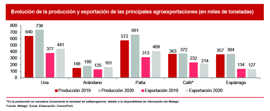 De acuerdo con el Ministerio de Desarrollo Agrario y Riego (Midagri), dicho desempeño se explicaría por las menores restricciones que enfrentó el sector, pues los productores nunca detuvieron sus labores diarias, lo que garantizó un abastecimiento normal de productos durante la pandemia. No obstante, esto también resultó favorecido por las mayores exportaciones agrícolas, que ascendieron a los US$ 7,517 millones el año pasado, un 6.1% más respecto de 2019. Esto porque la apertura comercial ha permitido que productos como las uvas, los arándanos, la palta, el café y los espárragos gocen de reputación internacional tras destinar el 60%, 89.1%, 62%, 57.7% y 35% de sus cosechas a diversos países el año pasado, respectivamente.