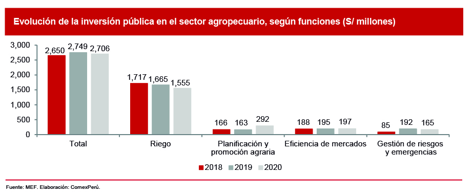 Así, el sector agrícola todavía presentaría enormes capacidades de desarrollo posibles de aprovecharse mediante el acceso a nuevos mercados y el establecimiento de alianzas para difundir el acceso a financiamiento. De manera que, en vez de oponerse a ello, las propuestas de políticas deberían enfocarse en mejorar la ejecución de la inversión pública, sobre todo en materia de acceso al riego, pues inclusive el BCRP ya advirtió en su último reporte de inflación que el déficit hídrico estaría perjudicando la campaña agrícola de agosto 2020 a julio 2021, lo que producirá un menor progreso del sector.