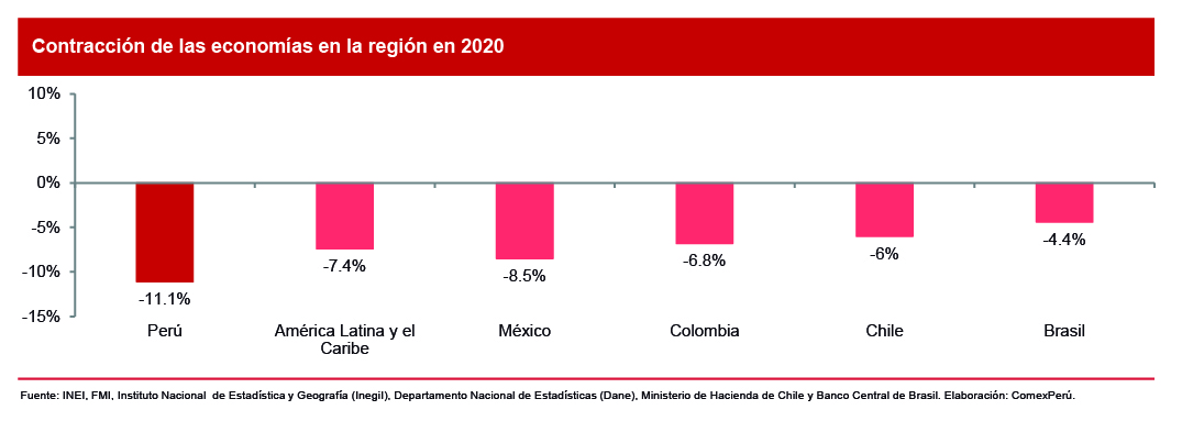 Según el Instituto Nacional de Estadística e Informática (INEI), la producción nacional creció en diciembre apenas un 0.5%, tras haber registrado resultados negativos durante nueve meses consecutivos. Esto ocasionó que la economía peruana acumulara un retroceso del 11.1% el año pasado, una caída mayor a la esperada para la región, que según el Fondo Monetario Internacional (FMI) sería del 7.4%. De esta manera, nuestro país se posicionó como uno de los más afectados en América Latina tras contraerse más que México (-8.5%), Colombia (-6.8%), Chile (-6%) y Brasil (-4.4%).