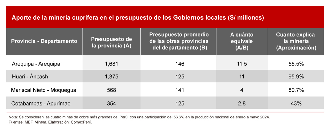 Esto se repite a partir de la participación de las cuatro minas de cobre más grandes del país. El presupuesto de la provincia de Arequipa asciende a S/ 1,681 millones, y equivale a 11.5 veces el presupuesto promedio de sus semejantes en el departamento del mismo nombre, gracias a la unidad principal de Cerro Verde. Sucede lo mismo con las provincias de Mariscal Nieto, en Moquegua (S/ 568 millones; 4 veces), que cuenta con la presencia de la unidad Quevalleco, de Anglo American, y Cotabambas, en Apurímac (S/ 354 millones, 2.8 veces), que alberga a Las Bambas.