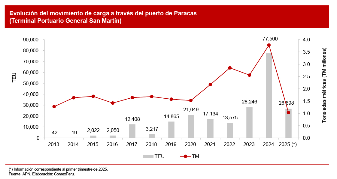 En conjunto, estas mejoras han consolidado al puerto de Paracas como una de las infraestructuras portuarias de mayor crecimiento del país en términos de movimiento de carga. En 2022, movilizó 13,575 TEU; en 2023, duplicó esa cifra, con 28,246 TEU; y en 2024 alcanzó los 77,500 TEU, lo que representó un crecimiento del 174.4% en un solo año, según cifras de la APN. En el primer trimestre de 2025, ya ha movilizado 26,698 TEU, un crecimiento interanual del 69.1%, y se proyecta un cierre anual superior a los 90,000 TEU, según estimaciones de TPP. Desde 2010, el volumen se ha multiplicado por más de 200, lo que evidencia el impacto transformador de la inversión privada.