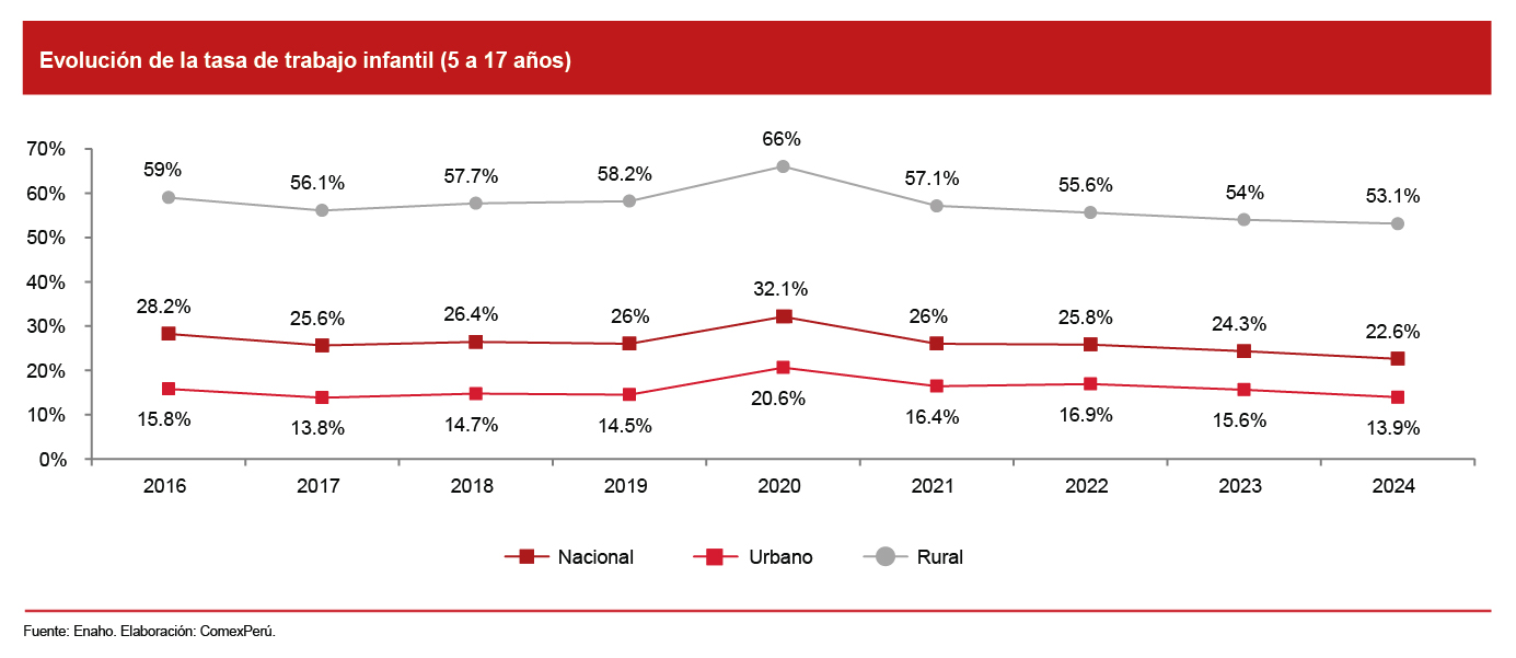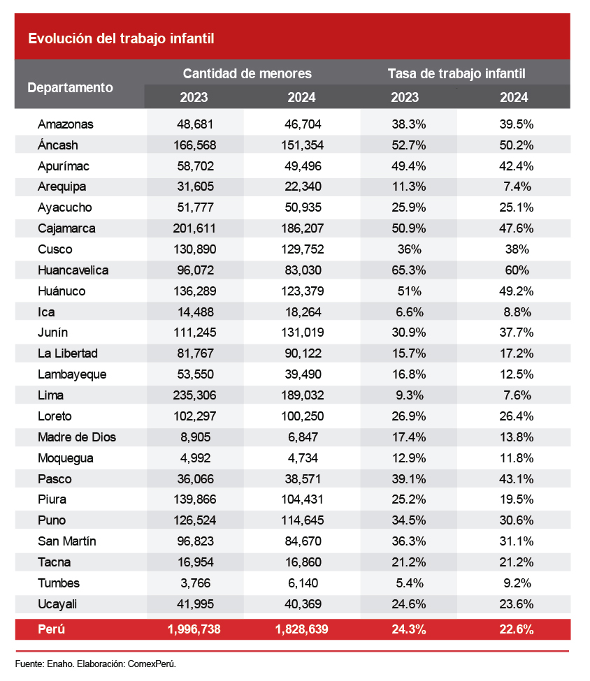A nivel departamental, el trabajo infantil disminuyó en 16 de 24 departamentos en 2024, en relación con 2023. Los mayores avances se observaron en Apurímac y Piura, donde las tasas retrocedieron 7 y 5.7 puntos porcentuales (pp.), respectivamente. Por otro lado, las tasas más elevadas se reportaron en Huancavelica (60%) y Áncash (50.2%).