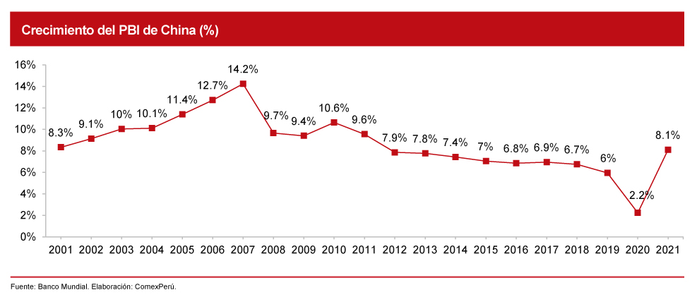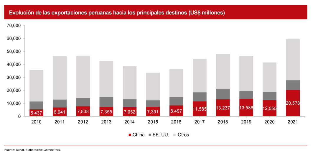En el caso del Perú, China es nuestro mayor comprador en la última década, por lo que un menor crecimiento de aquel tendría un fuerte impacto sobre las exportaciones peruanas. Entre 2010 y 2021, el 23% de las exportaciones de nuestro país se dirigieron al país asiático. Inclusive, en 2021, el 35% de nuestras exportaciones tuvieron como destino a China.
