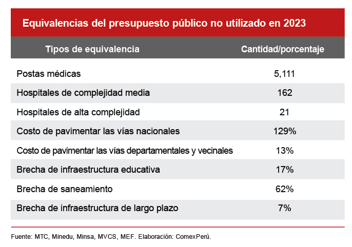 Por supuesto, este ejercicio debe tomarse con pinzas, dado que asumimos que todos los recursos sobrantes se dirigirían única y exclusivamente a alguna de las equivalencias mostradas, lo cual es un escenario poco realista. Pese a ello, es una forma muy clara de visualizar el resultado de que, año tras año, no sea posible alcanzar elevados niveles de ejecución del presupuesto: miles de millones de soles que no son utilizados representan múltiples oportunidades perdidas para brindar bienes y servicios públicos de calidad a los ciudadanos.