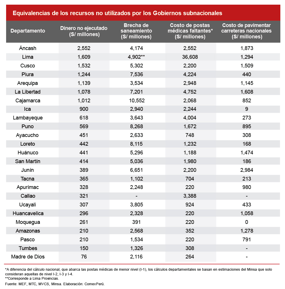 Realizamos cálculos similares para cada departamento, centrándonos en los recursos no utilizados por sus autoridades subnacionales, y ciertas equivalencias para las cuáles los datos estaban disponibles a este nivel de desagregación. De mayor a menor monto de recursos sin ejecutar, vemos que los Gobiernos subnacionales de Áncash lideran esta medición, con S/ 2,552 millones. Con dicho dinero se cubriría un poco más de la mitad de su brecha de saneamiento, la totalidad del costo de construir las postas médicas faltantes en el departamento, y el costo de pavimentar sus vías nacionales restantes, incluso con dinero de sobra. En total, en 15 departamentos, los recursos no ejecutados hubieran sido suficientes para al menos costear alguna de las equivalencias mostradas; 12 en el caso de la pavimentación de carreteras nacionales y 4 en el caso de las postas médicas faltantes.