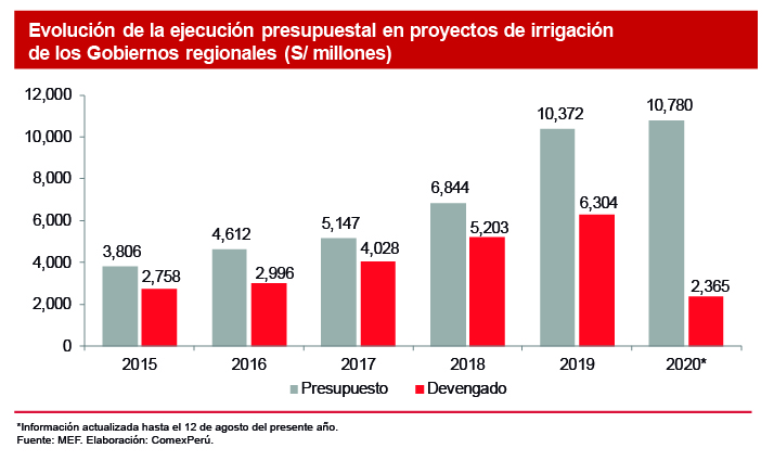 El presupuesto asignado a los Gobiernos regionales para la ejecución de proyectos de infraestructura de riego ha sido cada vez mayor. Sin embargo, la falta de ejecución del presupuesto otorgado ha aumentado en los últimos años, siendo ejecutado en 2019 solo el 61% del presupuesto. Una muestra de esto es que en el país continúan paralizados importantes proyectos de irrigación que contribuirían con la anhelada reactivación económica y sentarían las bases para mejoras significativas en la productividad agrícola del país de cara al futuro. Esto despierta el interés sobre la evaluación de la capacidad de los Gobiernos regionales para cumplir con la adecuada ejecución de los proyectos de infraestructura que se les asignan, ya que estos podrían significar el desarrollo de su región si se cuenta con una eficiente gestión de los recursos.