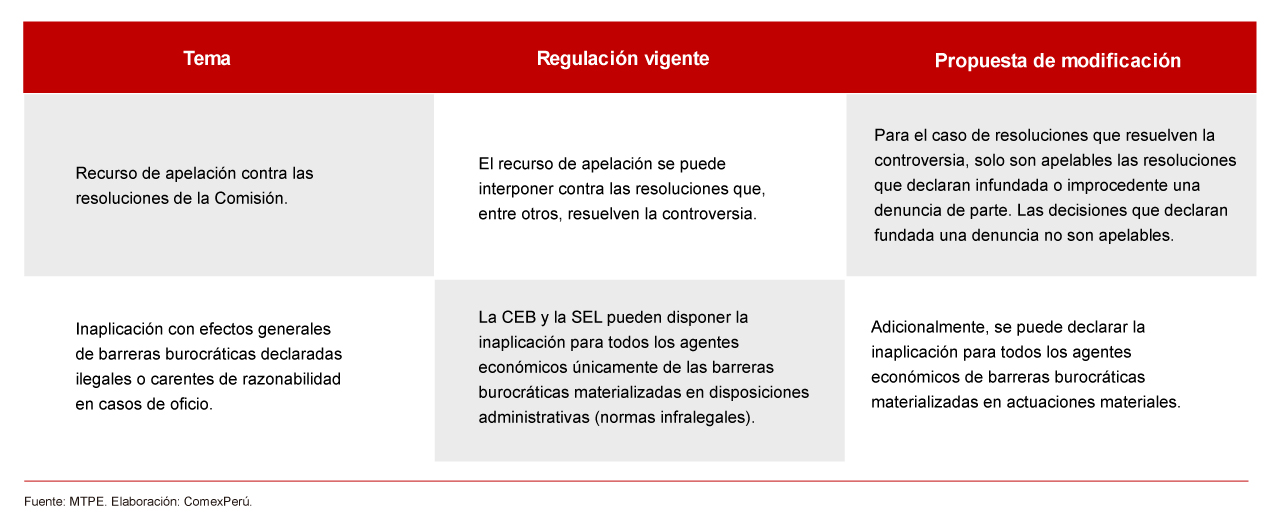 El principal cambio planteado por el Proyecto es la creación de una instancia única para cuando la CEB emita un pronunciamiento declarando fundada una denuncia de parte. Lo que busca la propuesta es evitar que un agente económico que cuente con una decisión fundada emitida por la CEB (y que dispone la inaplicación a su favor de una barrera ilegal o carente de razonabilidad), deba esperar por lo menos otros 120 días hábiles (aproximadamente 6 meses) para ver efectivizada esta decisión, por una eventual apelación de la entidad pública denunciada. Ello, debido a que el DL 1256 contempla un plazo legal de 120 días hábiles por instancia (CEB y SEL).