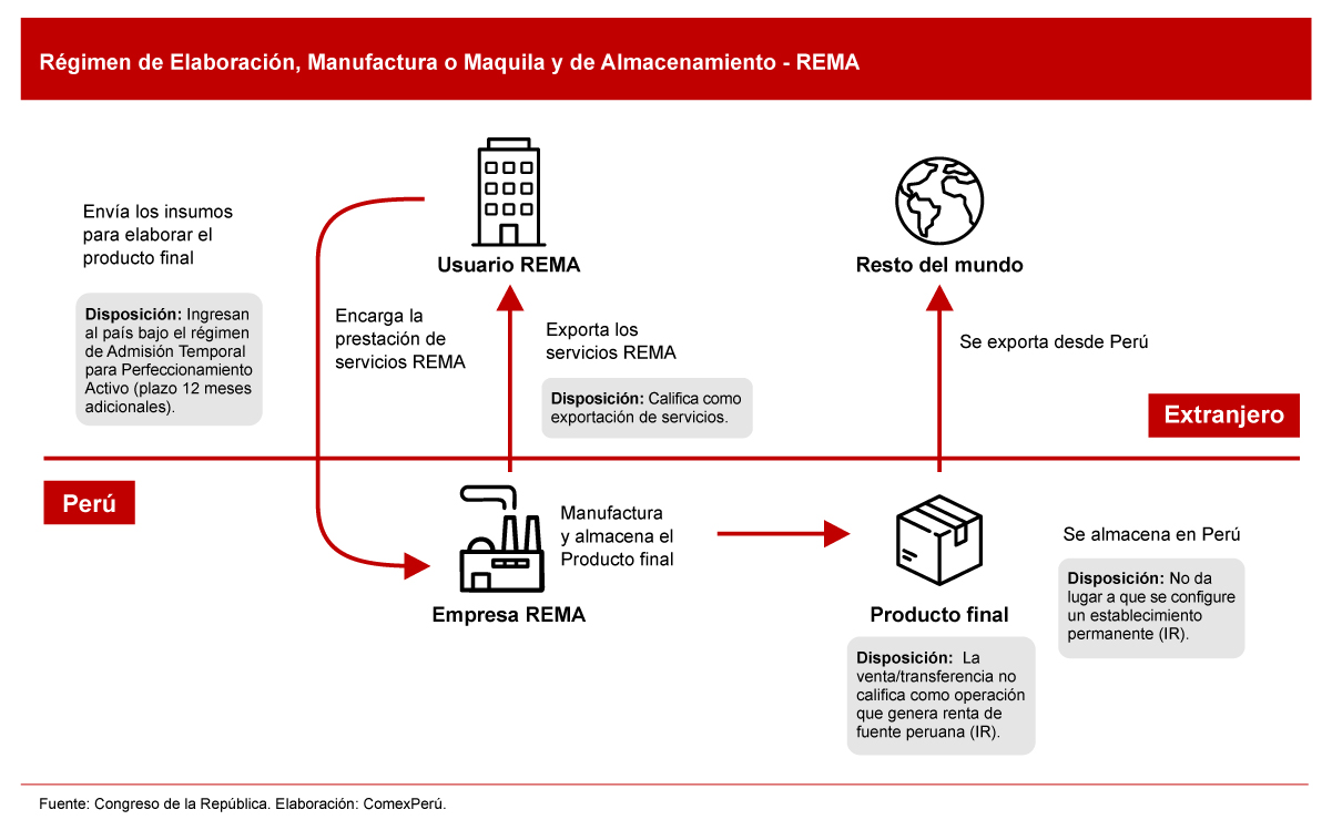 El REMA se presenta como una herramienta interesante para que las empresas peruanas puedan ofrecer servicios de transformación, acondicionamiento, ensamblaje o almacenamiento a empresas extranjeras, al generar nuevos ingresos sin necesidad de exportar productos propios.