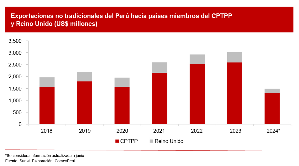 En el primer semestre del año, los envíos no tradicionales a Reino Unido mantuvieron su dinamismo. Estos registraron US$ 185 millones, lo que mostró un incremento del 11% con respecto al mismo periodo del año anterior. En contraste, las exportaciones de los productos no tradicionales a países del CPTPP registraron una ligera caída al sumar US$ 1,304 millones, un descenso del 1.1% interanual.