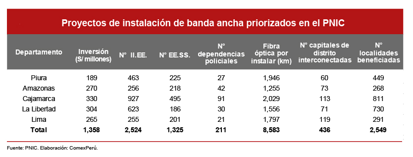 Estos comprenden la instalación de banda ancha para la conectividad integral y el desarrollo social en los departamentos de Lima (S/ 265 millones, en ejecución contractual), La Libertad (S/ 304 millones, en transacción), Amazonas (S/ 270 millones, en ejecución contractual), Piura (S/ 189, en ejecución contractual) y Cajamarca (S/ 330, en expediente técnico). En total, estos cinco proyectos proveerán de conexión a internet a 2,524 instituciones educativas (II.EE.), 1,325 establecimientos de salud (EE.SS.) y 211 dependencias policiales, e interconectarán a 436 capitales de distrito y 2,549 localidades.
