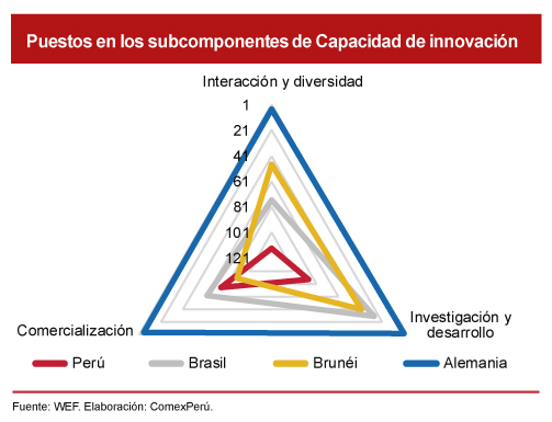 Dentro de los tres subcomponentes del pilar, el Perú ocupa su mejor posición (75 a nivel mundial) en Comercialización. Esto se debe principalmente al número de aplicaciones de registro de marcas (631.5 por millón de personas), cuyo nivel se ubica en el puesto 64, a la par de Ecuador. En contraposición, el mayor rezago que enfrenta, según lo analizado por el WEF, recae en la Interacción y diversidad de la innovación en economía (puesto 113). Tres de los cuatro subindicadores del componente Interacción y diversidad (concentración de sectores económicos, coinvenciones internacionales y colaboración entre empresas para la innovación) se ubican en puestos por debajo del 100.