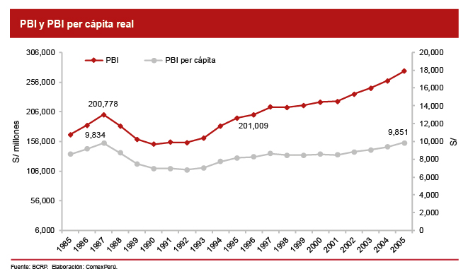 ¿Qué trajo consigo la total falta de estabilidad macroeconómica? La destrucción de la capacidad productiva e inversión en el país, lo que generó una reducción acumulada del PBI real del 27% y del 33% del PBI per cápita, entre 1988 y 1990, de la que llevó 9 y 18 años recuperarse, respectivamente. Fue, prácticamente, como si hubiéramos replicado el fenómeno de El Niño de 1983 en cada uno de los tres años, lo cual se tradujo en efectos nocivos para la sociedad, ya que, por ejemplo, de acuerdo con el Instituto Peruano de Economía, la pobreza pasó de un 42% de la población en 1985 al 55% en 1991, y la pobreza extrema, de un 18% a un 24%.