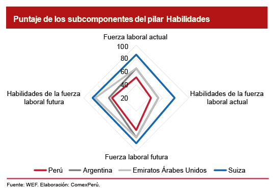 Este pilar está liderado por Suiza, país que también se ubicó en el primer puesto en los subcomponentes relacionados con la fuerza laboral actual, y segundo puesto en las habilidades de la fuerza laboral futura. De acuerdo con el WEF, Suiza, en los últimos años, ha enfatizado la innovación y asegurado la calidad educativa universitaria y técnica para garantizar la formación de una fuerza laboral calificada. Además, el resultado de la última medición de competitividad ha sido el fruto de la inversión en un sistema de formación que brinda oportunidades de especialización en áreas particulares. El objetivo de las políticas de capital humano está enfocado en garantizar que los jóvenes tengan una formación necesaria, acorde con las exigencias del mercado laboral, para insertarse de manera efectiva.