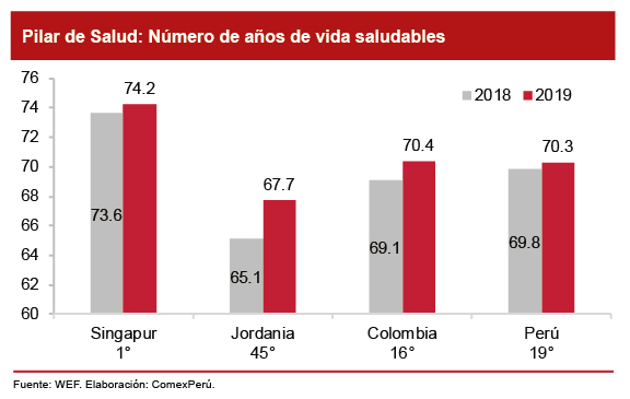 Contar con ciudadanos saludables y un sistema de salud adecuado contribuye al desarrollo de los países y a mejorar la calidad de vida para todos. Entre 2000 y 2016, la esperanza de vida se ha incrementado a 72 años (+5.5), mientras que la esperanza de vida saludable ha llegado a 63.3 (+4.8), según el reporte de Estadísticas Globales de Salud, elaborado por la Organización Mundial de la Salud. En particular, parte de esto se mide en el tercer pilar, Salud, del Reporte de Competitividad Global 2019, elaborado por el Foro Económico Mundial (WEF, por sus siglas en inglés).
