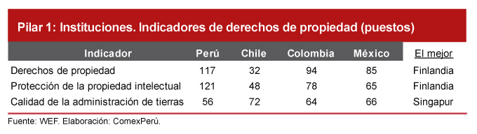 Según el WEF, los derechos de propiedad representan un asunto clave hoy en día, pues los agentes no invertirán en determinado país si tienen la percepción de que deberán destinar mucho tiempo y dinero a proteger lo que les pertenece. Por tanto, cabe preguntarnos si las entidades públicas en el Perú son capaces de proveerle seguridad a las inversiones privadas y de hacer cumplir los derechos de propiedad.