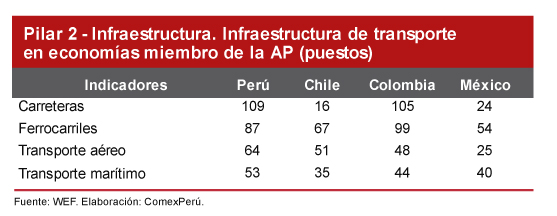 Según el último ranking de competitividad, nuestro país ocupa el puesto 96 de 140 economías en el indicador en cuestión, con una calificación de 39.1 sobre 100. El puntaje obtenido es el promedio de los resultados en los indicadores Carreteras (42.2), Ferrocarriles (15.5), Transporte aéreo (55.8) y Transporte marítimo (42.9).