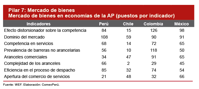 En el pilar analizado, nuestro país obtuvo el puesto 50 de un total de 140 economías, con una puntuación de 59.5 sobre 100. En comparación con los demás países de la Alianza del Pacífico (AP), el Perú ocupa el segundo lugar, pero bastante más lejos de Chile, que obtuvo el primer lugar, al obtener el puesto 13 en el ranking mundial, con una puntuación de 68.2. Por otro lado, México se ubicó en el puesto 54 y recibió un puntaje de 57.5, mientras que Colombia se posicionó en el puesto 85, con una puntuación de 54.