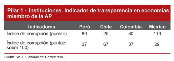 Por otro lado, al analizar la situación de los países miembros de la Alianza del Pacífico (AP), Chile es la economía que más resalta, incluso a nivel de América Latina y el Caribe. Nuestro país, junto a Colombia, ocupa el puesto 80 a nivel mundial y tiene una puntuación de 37, con lo que nos encontramos por debajo del promedio mundial. México, por su parte, fue el país de la AP que mostró el peor desempeño. Por tanto, es importante destacar la eficiente gestión del Gobierno chileno en los últimos años, que incluyó la lucha contra la corrupción como elemento clave en su agenda nacional. Además de realizar cambios en su legislación, fortaleció su Tribunal Calificador de Elecciones y su Servicio Electoral para que tengan mayor capacidad de fiscalización. Asimismo, introdujo de manera obligatoria la asignatura de educación cívica en los colegios, enfocada en fomentar una cultura más transparente y crítica en las generaciones más jóvenes. Además, la creación de ChileCompra, institución que administra la plataforma de comercio electrónico más grande del país, a través de la cual los organismos del Estado realizan sus adquisiciones, ha fomentado una práctica más transparente al hacer de conocimiento público qué compra el Estado, a qué proveedores y cuánto gasta.