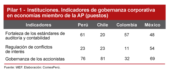 Por otra parte, nuestro país ocupa el puesto 56 a nivel mundial en cuanto a gobernanza de los accionistas (53 puntos sobre 100), el puesto 61 en fortaleza de los estándares de auditoría y contabilidad (62.4) y el puesto 23 en regulación de conflictos de interés (70). Al analizar los resultados de América Latina y el Caribe, resalta el desempeño positivo de la AP en general. Colombia y Chile son líderes en la región, mientras que el Perú y México ocupan el cuarto y quinto puesto, respectivamente. Así, tanto en Colombia como en Chile y en nuestro país, incrementar los requisitos de divulgación de datos para incrementar la transparencia entre las partes habría contribuido a mejorar la situación frente a los conflictos de interés. Asimismo, Colombia y Perú han hecho más fácil demandar a los directores cuando una transacción perjudica a la compañía y, de este modo, han fortalecido la gobernanza de los accionistas.