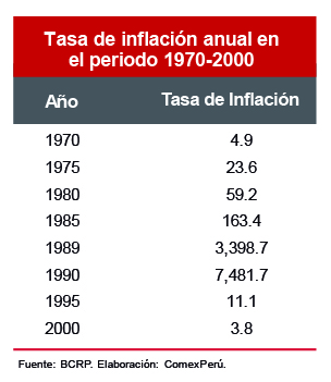 Basta con remontarse a los años setenta y ochenta para recordar la fallida política de sustitución de importaciones, cuyo objetivo era desarrollar el mercado interno y eliminar la dependencia del exterior. Según el Banco Central de Reserva del Perú (BCRP), las restricciones y prohibiciones a la importación fueron acompañadas por un sistema arancelario que contemplaba más de 56 tasas que oscilaban entre el 10% y el 84%, y a falta de capital en determinadas industrias se procedió a crear empresas estatales. La escasez originada por la baja productividad de sectores como el agrícola, propició la creación de la Empresa Nacional de Comercialización e Insumos (ENCI), cuyas importaciones tenían precios subsidiados. Sostener tantas políticas populistas no fue viable, por lo que llegó el punto en el que la crisis económica empezó a reflejarse también en la inflación, que a partir de 1970 se mantuvo al alza. Fue en 1990 que se alcanzó una inflación de 7,481.7%, pero a partir del siguiente año decreció drásticamente, gracias a las reformas económicas aplicadas en la década, entre ellas la promoción del comercio exterior mediante la reducción de las tarifas arancelarias.