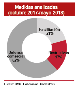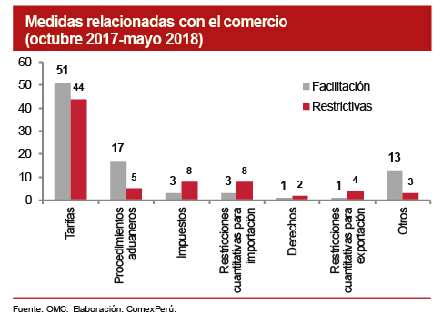Según la OMC, la implementación de medidas orientadas a la facilitación comercial continuó; sin embargo, el valor comercial cubierto por estas ha disminuido, mientras que el de las medidas restrictivas aumentó. De esta forma, entre octubre de 2017 y mayo de 2018, se registraron 89 nuevas medidas facilitadoras, con un promedio mensual de 13, número superior al registrado en el mismo periodo de 2017 (11). Asimismo, se dictaron 75 nuevas medidas restrictivas al comercio, con un promedio mensual de 11, también superior al alcanzado en el periodo anterior (9). En ambos casos, más del 80% de las medidas se concentraron en operaciones de importación y cubrieron unos US$ 107,300 millones, en el caso de las medidas facilitadoras, y unos US$ 84,500 millones, en el de las medidas restrictivas, es decir, un 0.68% y un 0.53% de las importaciones mundiales de bienes, respectivamente.