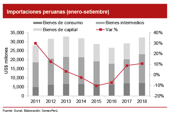 Según cifras de la Sunat, entre enero y setiembre de 2018, las importaciones peruanas sumaron un total de US$ 32,260 millones, un 10.7% más con respecto al mismo periodo del año anterior. De esta manera, reafirmaría su dinamismo que empezó en 2017, tras tres años de caída. Este resultado positivo fue impulsado por el crecimiento de las importaciones de bienes intermedios (+18.4%), las de bienes de consumo (+4.4%) y las de bienes de capital (+4.1%). Cabe mencionar que, en el mes de setiembre, las importaciones sumaron US$ 3,485 millones, un 1.1% más que en el mismo mes de 2017.