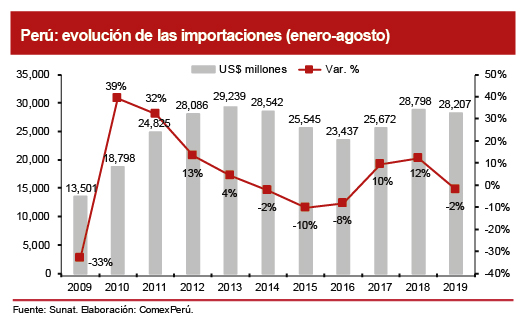 Las importaciones peruanas continúan a la baja este año. Según cifras de la Sunat, en el periodo enero-agosto de 2019, estas alcanzaron un valor de US$ 28,798 millones, lo que representa una caída del 2% con respecto al mismo periodo de 2018. Cabe mencionar que, en el mes de agosto, las importaciones peruanas cayeron un 6.2% con relación al mismo mes del año pasado, lo que significa cuatro meses consecutivos a la baja.