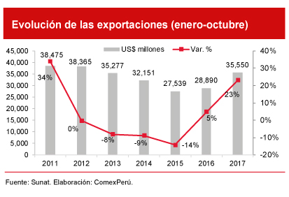 De acuerdo con la Sunat, en el periodo enero-octubre del presente año, nuestros envíos al exterior ascendieron a US$ 35,550 millones, cifra un 23.1% mayor con respecto al mismo periodo de 2016.
