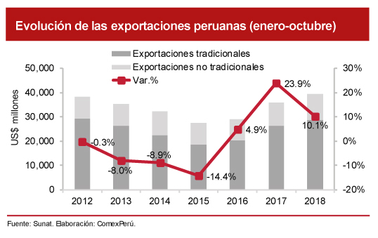 De acuerdo con cifras de la Sunat, entre enero y octubre de 2018, las exportaciones peruanas sumaron un total de US$ 39,412 millones, lo que representó un incremento del 10.1% en comparación con el mismo periodo de 2017. Dicho resultado estuvo impulsado por nuestros envíos de los rubros no tradicional (+14.8%) y tradicional (+8.4%). Al respecto, si bien nuestras exportaciones mantienen una tendencia positiva desde 2016, el ritmo de crecimiento ha disminuido como consecuencia de la desaceleración de las exportaciones tradicionales.