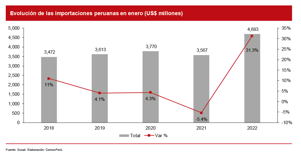 De acuerdo con cifras de la Sunat, en el mes de enero de 2022, se registró un incremento del 31.3% en las importaciones con respecto al mismo mes del año previo. Estas sumaron un total de US$ 4,683 millones y el resultado se debió, principalmente, a las mayores compras de bienes intermedios.