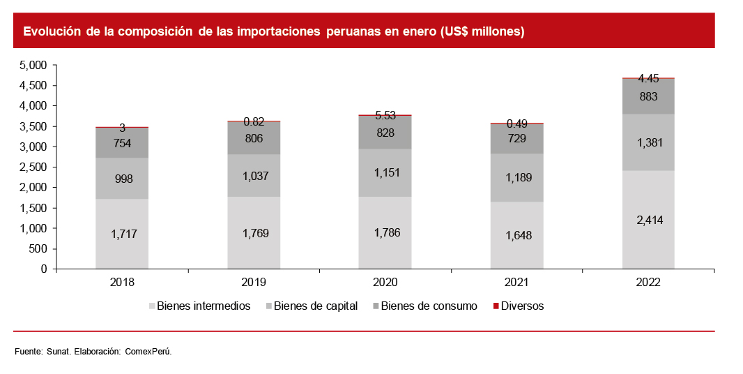 El dinamismo alcanzado por las importaciones peruanas en enero de 2022 da cuenta de la recuperación económica a nivel mundial. La mayor participación de nuestras importaciones se refiere a bienes intermedios y de capital, que representaron el 81% del total de las importaciones del primer mes del presente año.