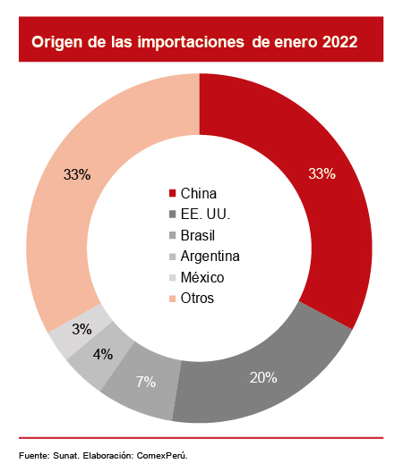 Durante enero de 2022, poco más de la mitad de nuestras importaciones provino de China y EE. UU., en conjunto. Las importaciones al país asiático en el primer mes de 2022 ascendieron a US$ 1,532 millones, con un incremento del 46.9% con respecto al mismo mes del año previo. En cuanto a las importaciones de provenientes de EE. UU., en enero de 2022, estas ascendieron a US$ 928 millones, un 22.9% más que en enero de 2021. Y, completando la lista de los cinco principales países de origen de nuestras importaciones, figuran Brasil (US$ 337 millones; +25.3%), Argentina (US$ 198 millones; +116.3%) y México (US$ 141 millones; +20.6%).