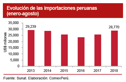 De acuerdo con cifras de la Sunat, entre enero y agosto de 2018, las importaciones peruanas sumaron US$ 28,770 millones, un 12% más con respecto al mismo periodo de 2017. Con dicho resultado se reafirmaría el dinamismo de los dos últimos años, luego de un periodo de caídas. En lo que respecta a las importaciones de bienes intermedios, estas presentaron un crecimiento del 19.4%, mientras que las de bienes de consumo aumentaron un 5.7% y las de bienes de capital, un 5.5%. Cabe resaltar que, en cuanto a los bienes de capital, destacaron aquellos relacionados con los equipos de transporte, que registraron un crecimiento del 17.4%, y aquellos para la agricultura, que crecieron un 11.2%.