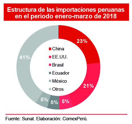 De acuerdo con cifras de la Sunat, en los primeros tres meses del año, las importaciones peruanas alcanzaron un valor de US$ 10,309 millones, un 11.1% mayores con respecto al mismo periodo del año anterior. Cabe destacar que el buen desempeño de nuestras importaciones se debió principalmente a las compras provenientes de China, que registraron un incremento del 19%, al pasar de US$ 2,017 millones en el periodo enero-marzo de 2017 a US$ 2,401 millones para el mismo periodo de 2018, y representaron un 23% del total de nuestras importaciones. Asimismo, en el segundo lugar del ranking de importación se ubicó EE.UU., con US$ 2,160 millones, lo que representó un aumento del 2.6% con respecto a los tres primeros meses de 2017 (US$ 2,105 millones) y un 21% del total.