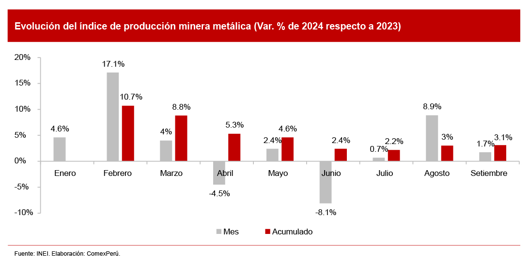 El sector minero metálico creció un 3.1% durante enero-setiembre de 2024, comparado con el mismo periodo de 2023, según el Ministerio de Energía y Minas (Minem). El cobre y el oro fueron los principales determinantes del resultado actual, al explicar aproximadamente el 50.8% de nuestra cartera productiva. Por su parte, la producción de oro creció un 9.7% y la de cobre disminuyó un 0.6%, en comparación con el mismo periodo del año anterior. Otros metales que destacaron fueron el molibdeno (+30.8%), la plata (+16%) y el zinc (-11.7%).